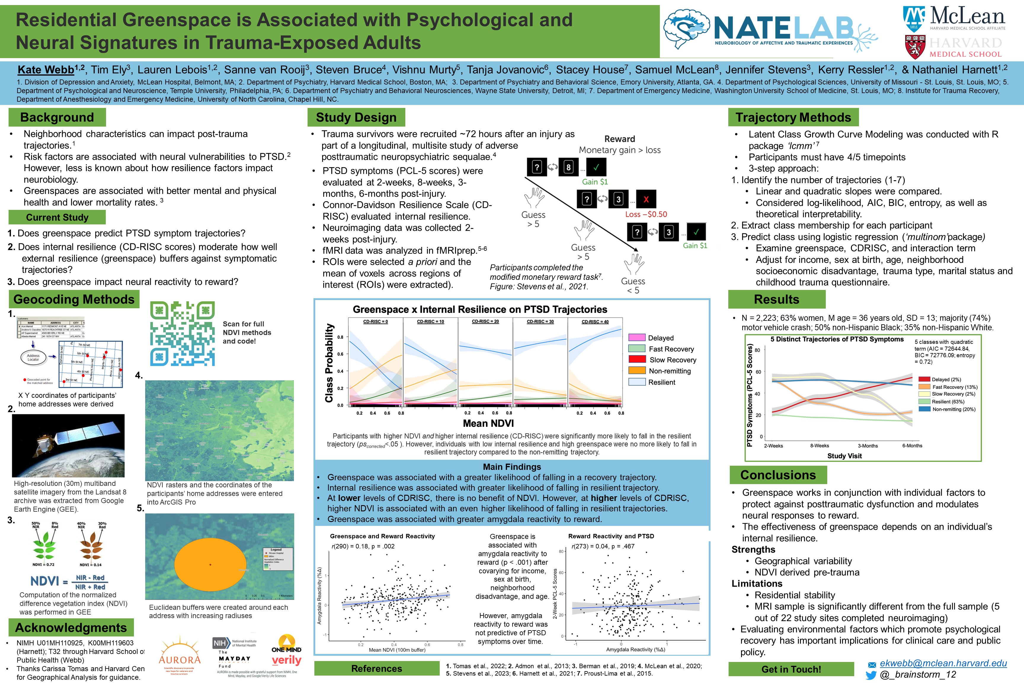 As part of my postdoctoral training, I expanded my skillset to include geospatial analyses to quantify additional neighborhood factors such as greenspace. Our initial results indicate that greater residential greenspace (derived through satellite-imagery) is associated with differential reactivity to reward, but not threat, within the amygdala. Further, we identified a novel interaction between an individual’s internal resilience (i.e., how well they believe they can cope with a problem) and greenspace. Individuals with greater exposure to greenspace and internal resilience show faster recovery following trauma (i.e., rapid decrease in PTSD symptoms across time). Thus, these data further suggest that greenspace modulates neural function following trauma exposure and enhances individual resilience to improve trauma outcomes.